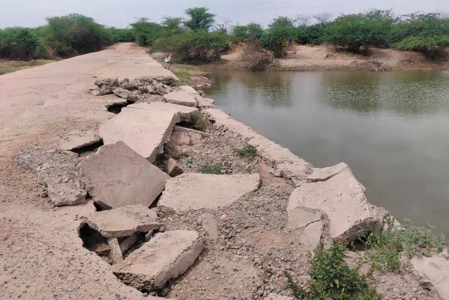 साँचोर-टांपी-गलिफा मार्ग पर लूणी नदी की पुलिया टूटी:बहाव क्षेत्र में सड़क धंसी, आवागमन बाधित; ग्रामीण परेशान