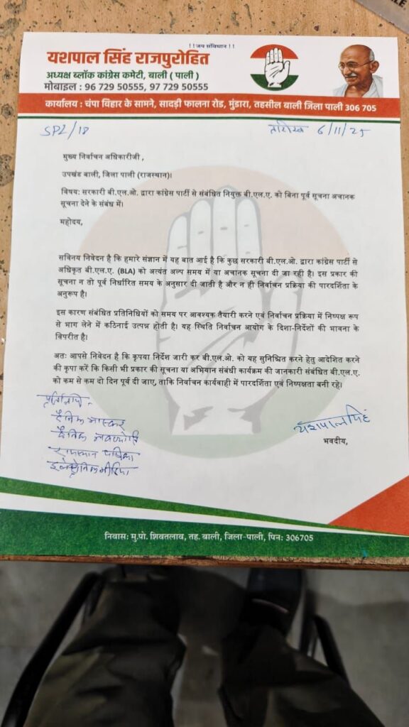 बाली ब्लॉक कॉग्रेस अध्यक्ष यशपाल सिंह राजपुरोहित ने बाली उपखण्ड अधिकारी दिनेश विश्नोई को ज्ञापन देकर बी.एल.ओ. द्वारा कांग्रेस पार्टी से अधिकृत बी.एल.ए. (BLA) को अत्यंत अल्प समय में या अचानक सूचना दी जा रही है। इस प्रकार की सूचना न तो पूर्व निर्धारित समय के अनुसार दी जाती है और न ही निर्वाचन प्रक्रिया की पारदर्शिता के अनुरूप है।