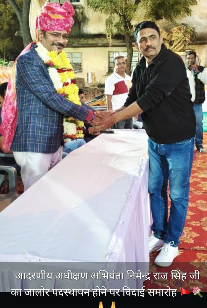 इंजीनियर सुपरवाइजर सुखसिंह खंगारोत ने बताया की अधिशासी अभियंता निमेंद्र राज सिंह फालना के अधीक्षण अभियंता पद पर पदोन्नत होने पर एवं जालौर स्थानांतरण होने पर कर्मचारियों द्वारा भव्य भावभीनी विदाई दी गई