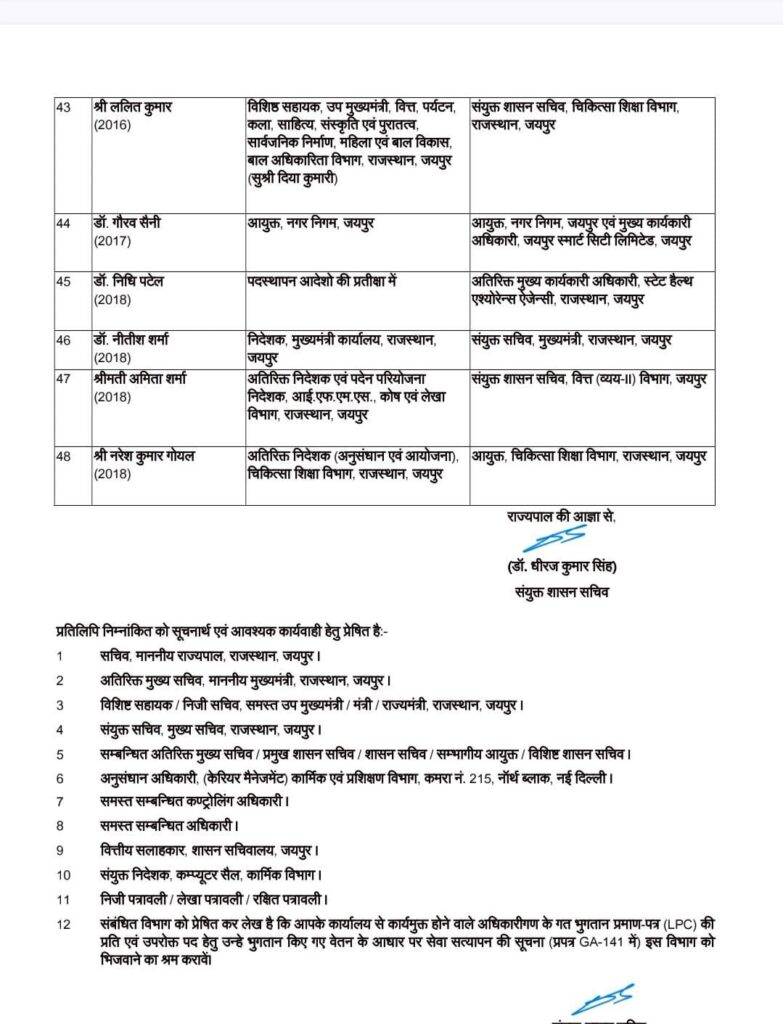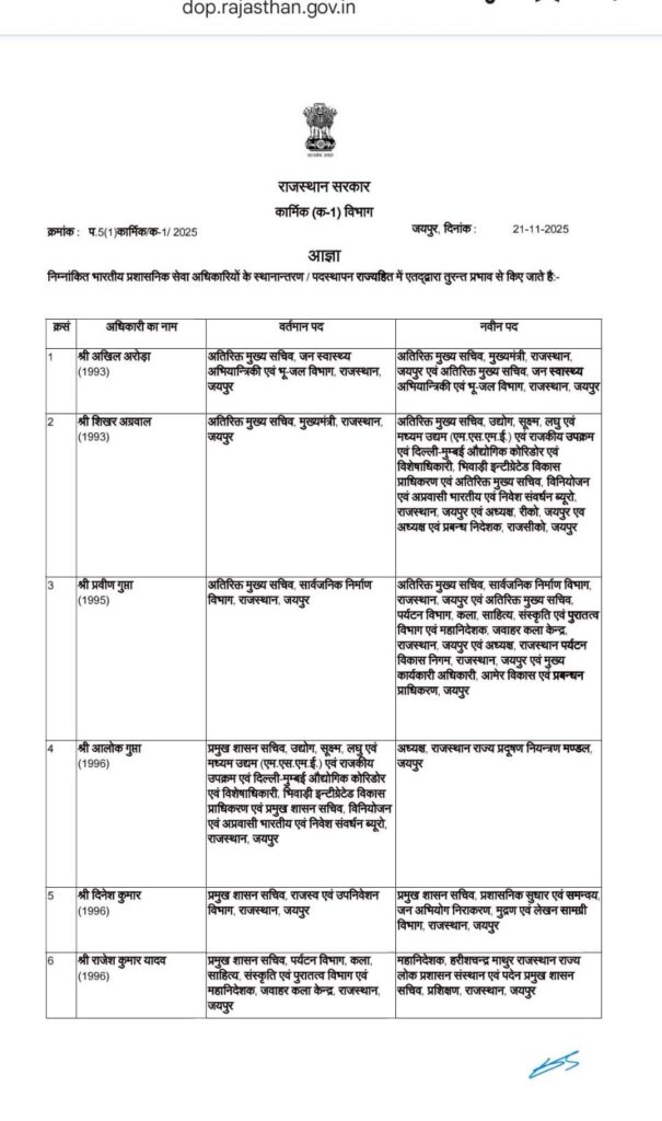 जयपुर-राज्य सरकार ने शुक्रवार रात बड़ा प्रशासनिक फेरबदल करते हुए 48 आईएएस अफसरों के तबादले किए। मुख्यमंत्री के एसीएस शिखर अग्रवाल को हटाकर उद्योग विभाग में भेज दिया है। जलदाय विभाग के एसीएस अखिल अरोड़ा को मुख्यमंत्री के एसीएस के पद पर लगाया है।