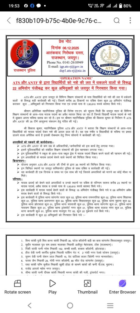 जयपुर-ATS और ANTF के द्वारा विद्यार्थियों को नशे की लत में धकलने वालों के विरूद्ध 22 अभियोग पंजीबद्ध कर कुल अभियुक्तों को जयपुर में गिरफ्तार किया गया। ATS और ANTF द्वारा जयपुर के विभिन्न शिक्षण संस्थानों के पास विद्यार्थियों को नशे की लत में धकेलने वालों के विरूद्ध बडी कार्यवाही की गई। जिसमें करीब 35 ठिकानों पर दबिश देकर कुल 22 अभियोग पंजीबद्ध कराकर कुल… अभियुक्तों को गिरफ्तार किया गया एवं उनके पास से 1.93,610 रूपये बरामद किये गये।अतिरिक्त महानिदेशक पुलिस दिनेश एम.एन. को सूचना मिली कि जयपुर शहर के विभिन्न शिक्षण संस्थानों के आस-पास मादक पदार्थ का अवैध व्यापार किया जा रहा है जिनसे विद्यार्थी मादक पदार्थ के नशे में डूबकर अपना भविष्य खराब कर रहे है। इस पर महानिरीक्षक पुलिस विकास कुमार के निर्देशन में ATS और ANTF की 35 टीमें आसूचना संकलन हेतु गठित की गई।