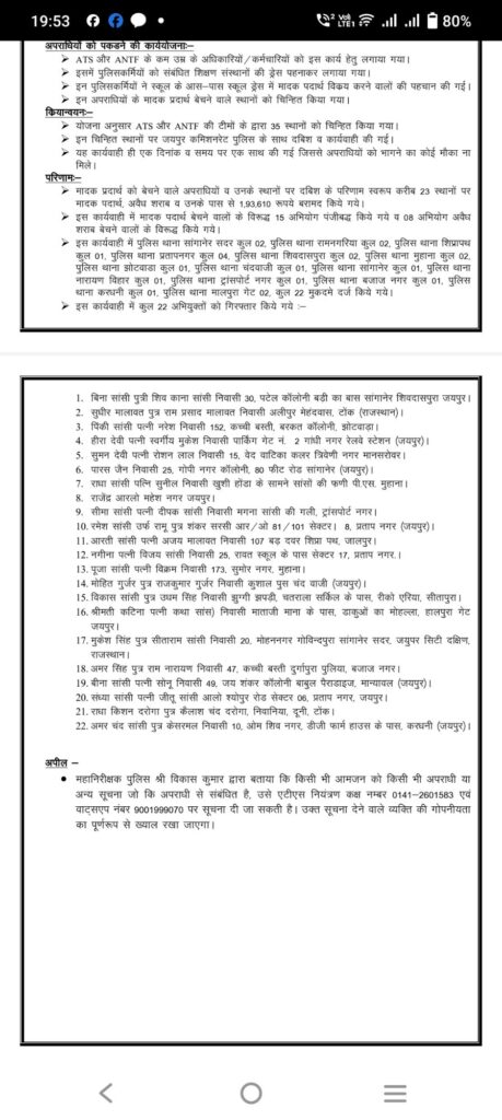 परिणामः-मादक प्रदार्थ को बेचने वाले अपराधियों व उनके स्थानों पर दबिश के परिणाम स्वरूप करीब 23 स्थानों पर मादक पदार्थ, अवैध शराब व उनके पास से 1,93,610 रूपये बरामद किये गये। इस कार्यवाही में मादक पदार्थ बेचने वालों के विरूद्ध 15 अभियोग पंजीबद्ध किये गये व 08 अभियोग अवैध शराब बेचने वालों के विरूद्ध किये गये। इस कार्यवाही में पुलिस थाना सांगानेर सदर कुल 02. पुलिस थाना रामनगरिया कुल 02. पुलिस थाना शिप्रापथ कुल 01, पुलिस थाना प्रतापनगर कुल 04, पुलिस थाना शिवदासपुरा कुल 02. पुलिस थाना मुहाना कुल 02. पुलिस थाना झोटवाडा कुल 01, पुलिस थाना चंदवाजी कुल 01, पुलिस थाना सांगानेर कुल 01. पुलिस थाना नारायण विहार कुल 01. पुलिस थाना ट्रांसपोर्ट नगर कुल 01, पुलिस थाना बजाज नगर कुल 01, पुलिस थाना करधनी कुल 01, पुलिस थाना मालपुरा गेट 02. कुल 22 मुकदमे दर्ज किये गये