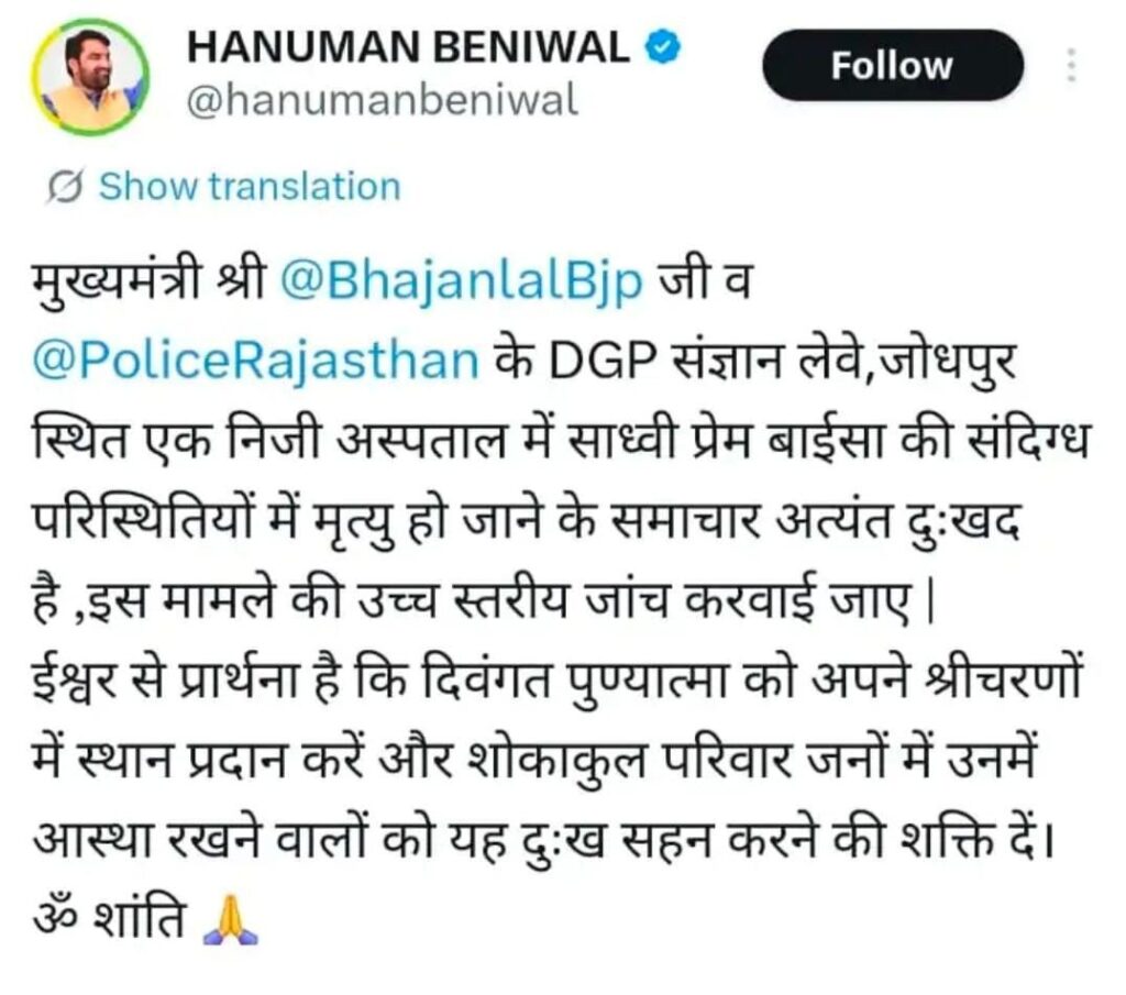 RLP सांसद हनुमान बेनीवाल ने ट्वीट कर साध्वी प्रेम बाईसा की संदिग्ध परिस्थितियों में मौत की उच्च स्तरीय जांच की मांग की है।
