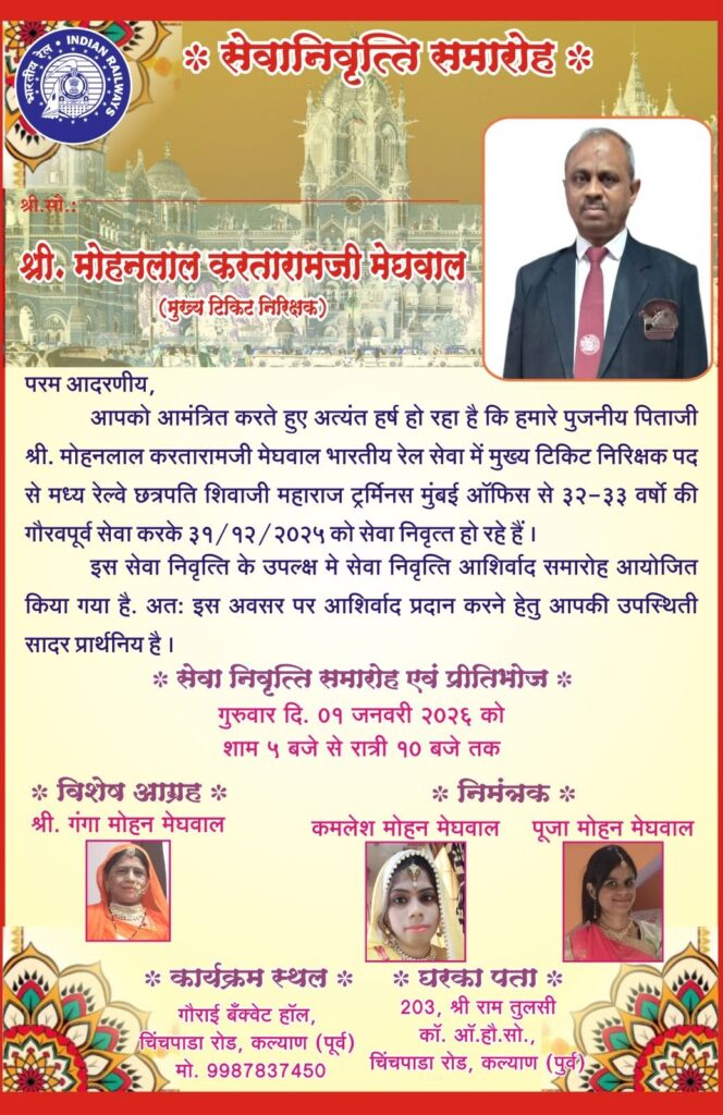 बाली/मुंबई। बाली उपखंड के ग्राम लुंदाड़ा निवासी मोहनलाल पुत्र करता राम मेघवाल भारतीय रेल सेवा में अपनी लंबी और सराहनीय सेवाओं के बाद ‘मुख्य टिकट निरीक्षक’ (CTI) के पद से सेवानिवृत्त हो गए हैं। उनकी सेवानिवृत्ति के अवसर पर देश की आर्थिक राजधानी मुंबई में एक भव्य विदाई एवं स्वागत समारोह का आयोजन किया गया।
