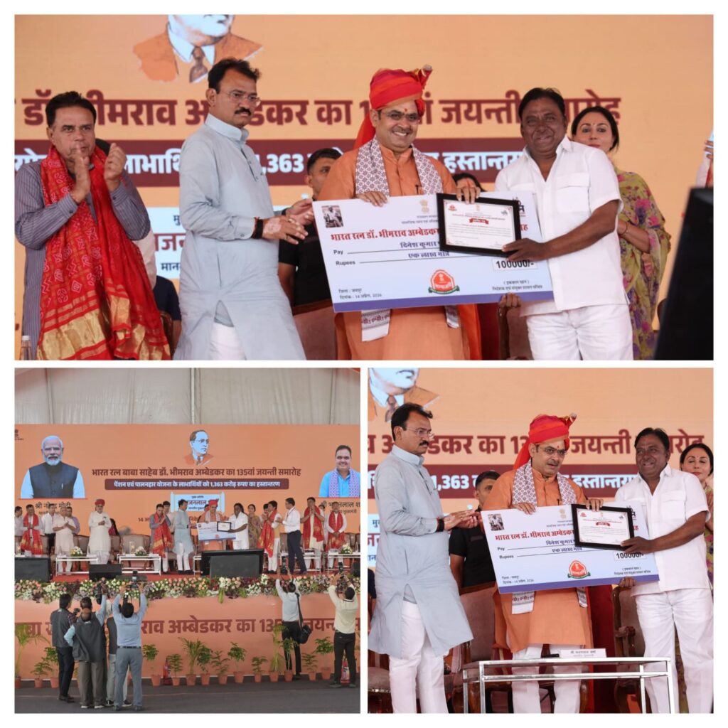 जयपुर में मंगलवार को अंबेडकर जयंती पर आयोजित राज्य स्तरीय सम्मान समारोह में आऊवा गांव के दिनेश पंवार को सम्मानित किया गया। उन्हें भारत रत्न संविधान निर्माता डॉ. भीमराव अंबेडकर की 135 वीं जयंती के अवसर पर समाज सेवा के क्षेत्र में उत्कृष्ट योगदान के लिए यह सम्मान प्रदान किया गया।