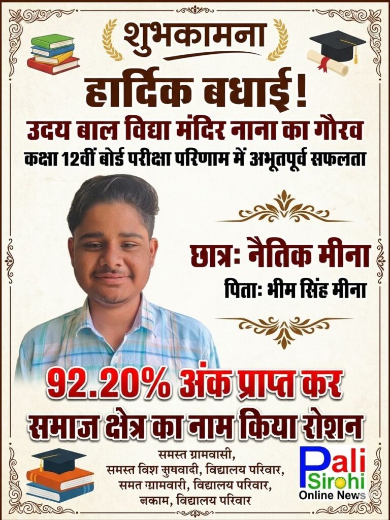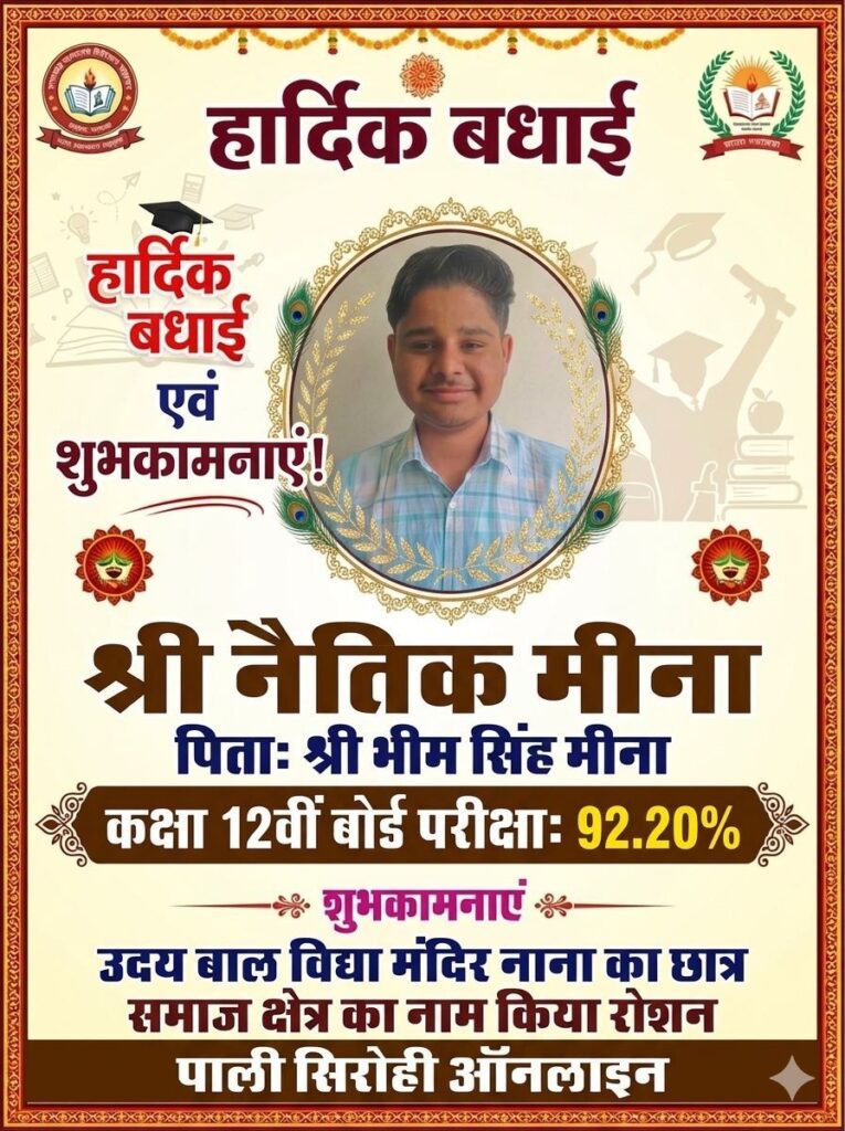 नाना रेलवे स्टेशन के नैतिक मीना ने 92.20% अंक प्राप्त कर बढ़ाया क्षेत्र का मान, उदय बाल विघा मन्दिर को भी मिल रही बधाइयां