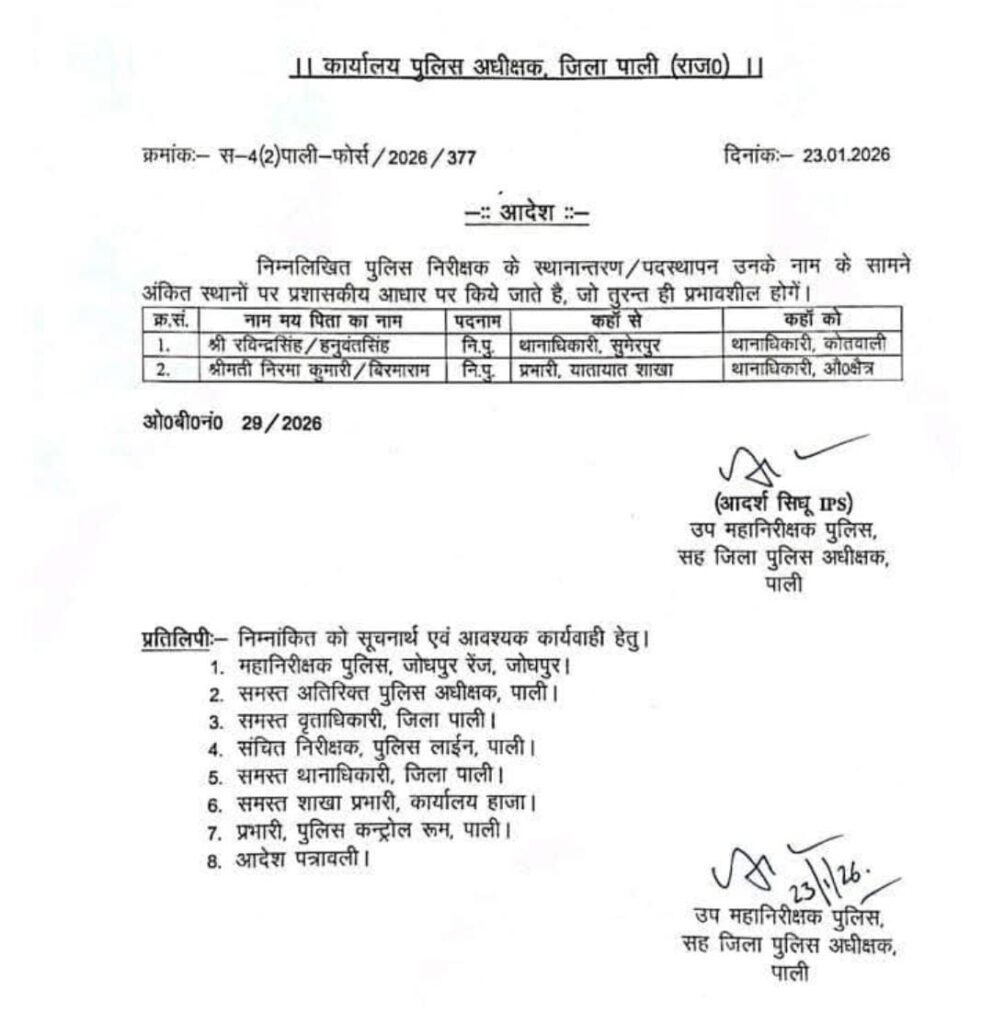 इसके तहत सुमेरपुर थानाप्रभारी रविन्द्र सिंह खिंची का ट्रांसफर कोतवाली थाने और यातायात प्रभारी निरमा विश्नोई का ट्रांसफर औद्योगिक थाना पाली में किया गया है। बता दे कि खिंची इससे पहले सोजत और पाली के कोतवाली थाने के प्रभारी रह चुके है। वही निरमा विश्नोई को औद्योगिक थाने की कमान सौंपी गई है।