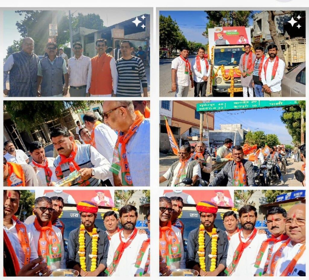 रानी – राजस्थान के माननीय मुख्यमंत्री श्री भजनलाल जी शर्मा के नेतृत्व में भाजपा सरकार के सफलतम 2 साल पूर्ण होने पर सरकार द्वारा निकाली गई , । रानी रथ यात्रा संयोजक जयन्तिलाल वैष्णव के अनुसार *सुशासन रथयात्रा का रानी में लाल मन्दिर सिनेमा हाल से शुभारंभ 14 दिसंबर को सुबह 10 बजे हरी झंडि दिखाकर रथ को रवाना किया , रानी शहर मंडल अध्यक्ष हरिश गहलोत, उपाध्यक्ष डालचंद चौहान, सहसंयोजक ईश्वर सिंह राजपुरोहित, सहसंयोजक पवन मेवाडा के सानिध्य में किया गया , रथ रानी के विभिन्न मार्गो से होकर गुजरा भाजपा के नारे लगे,