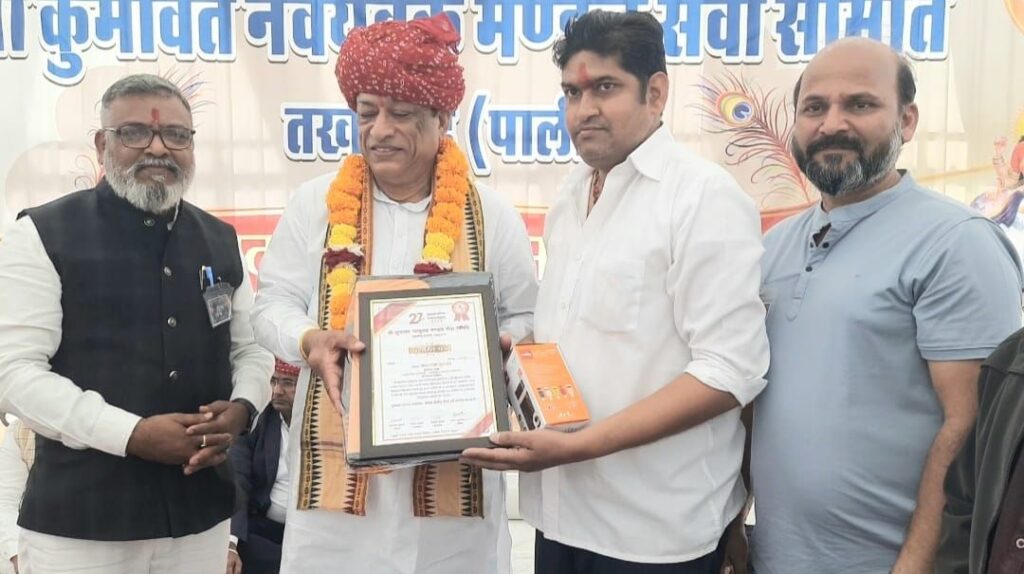 27वे प्रतिभा समारोह 2025 के अवसर पर सहयोगकतों भामाशाह समारोह के संपूर्ण व्यवस्था के लाभार्थी शंकरलाल मेवाड़ा और समर्थराम टांक, चुन्नीलाल नवाजी मेवाड़ा, चतराराम चांदोरा एवं श्रीमती दीपीबाई बड़वाल, नारायण लाल मेवाड़ा, किशोर कुमार रोटांगन, बाबूलाल वीराजी , चौथाराम गुगोण, श्रीमती हंजा देवी रोटांगण, पुखराज पाडीवा, और सवाराम रोटांगण परिवार के सदस्यों सहित पुखराज सोलंकी व्यापार मंडल अध्यक्ष सुमेरपुर, गोड़वाड़ कुमावत शिक्षा समिति अध्यक्ष भूराराम मालवीय, एसीबीओ जीवारिम टांक, व्यापार और उद्योग मंडल अध्यक्ष चंपालाल कुमावत, पूर्व नगर पालिका ईओ अनोपसिह राठौड,का कुमावत नवयुग मंडल सेवा समिति के पदाधिकारीयो द्वारा सोल ओढाकर एवं साफा एवं माला पहनकर मोमेंटो भेटकर सम्मानित किया गया। समारोह के समापन पर समिति अध्यक्ष मोहनलाल पाडीवा ने सभी अतिथियों एवं भामाशाहो का आभार व्यक्त किया मंच संचालन नरपत आर्य आहोर एवं परशुराम ने किया। कार्यक्रम के दौरान जितेंद्र चांदोरा, परशुराम कुमावत, दिनेश रामीणा शांतिलाल रामीणा, त्रिभुवन बड़वाल सहित समाज के समस्त युवा कार्यकर्ता एवं समाज बंधु उपस्थित रहे।