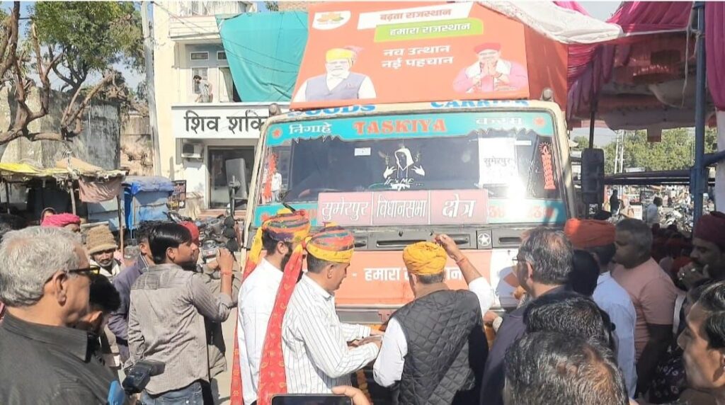 राज्य सरकार के दो वर्ष पूर्ण होने के उपलक्ष्य विकास रथ पहुंचा तखतगढ़,रथ पर लगी स्क्रीन के माध्यम से केंद्र व राज्य सरकार की योजनाओं की नगर वासियों ने ली जानकारी
