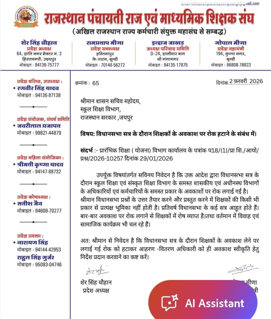 राजस्थान पंचायती राज एवम माध्यमिक शिक्षक संघ प्रदेश संघर्ष समिति संयोजक जवरी लाल प्रजापत बांजाकुड़ी ने बताया कि संगठन ने शिक्षा सचिव शिक्षा विभाग राजस्थान सरकार को ज्ञापन भेज कर विधानसभा सत्र के दौरान शिक्षक वर्ग के अवकाश लेने पर रोक हटाने तथा केवल उन्हीं कार्मिकों के अवकाश पर रोक लगाई जाने की मांग की है जो प्रत्यक्ष रूप से विधानसभा प्रश्नों के जवाब तैयार कर भेजने में भूमिका का निर्वहन करते हैं।